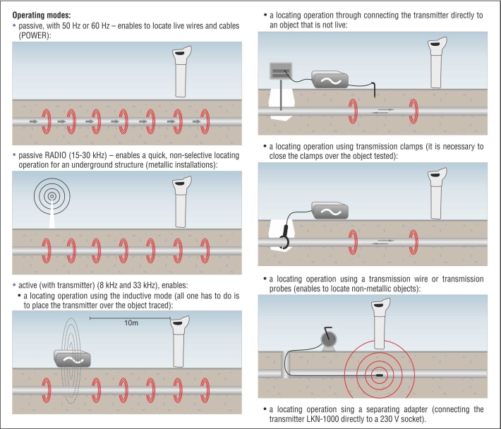 - Detection of underground wires with no voltage using a transmitter (galvanised, inductive or clamp-based connection).