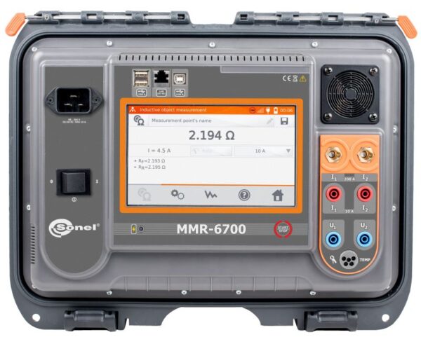 The MMR-6700 digital meter is designed for measuring low resistances with a stabilised current of up to 200 A. The use of test clamps enables the safe measurement of breakers (high-, medium- and lowvoltage), isolators and other components earthed on both sides. The MMR-6700 series meters are equipped with a unique module in their class that measures inductive components which have a current of up to 10 A, enabling the winding resistance of motors, transformers and other inductive components to be measured. Another useful function is the temperature measurement and the automatic compensation of results with relation to the measured temperature or temperature set by the user. The system is completed with a recorder function. Special measuring algorithms and additional functions allow an appropriate measuring method to be chosen depending on the measured component and measurement conditions, thus, widening the application areas of the meter. The state-of-the-art user interface, various communication interfaces, wireless communication and communication with the computer, printer, 2D code reader are integrals features which enable full, comfortable and intuitive management of not only measurements and their results but also ID data of measured components.